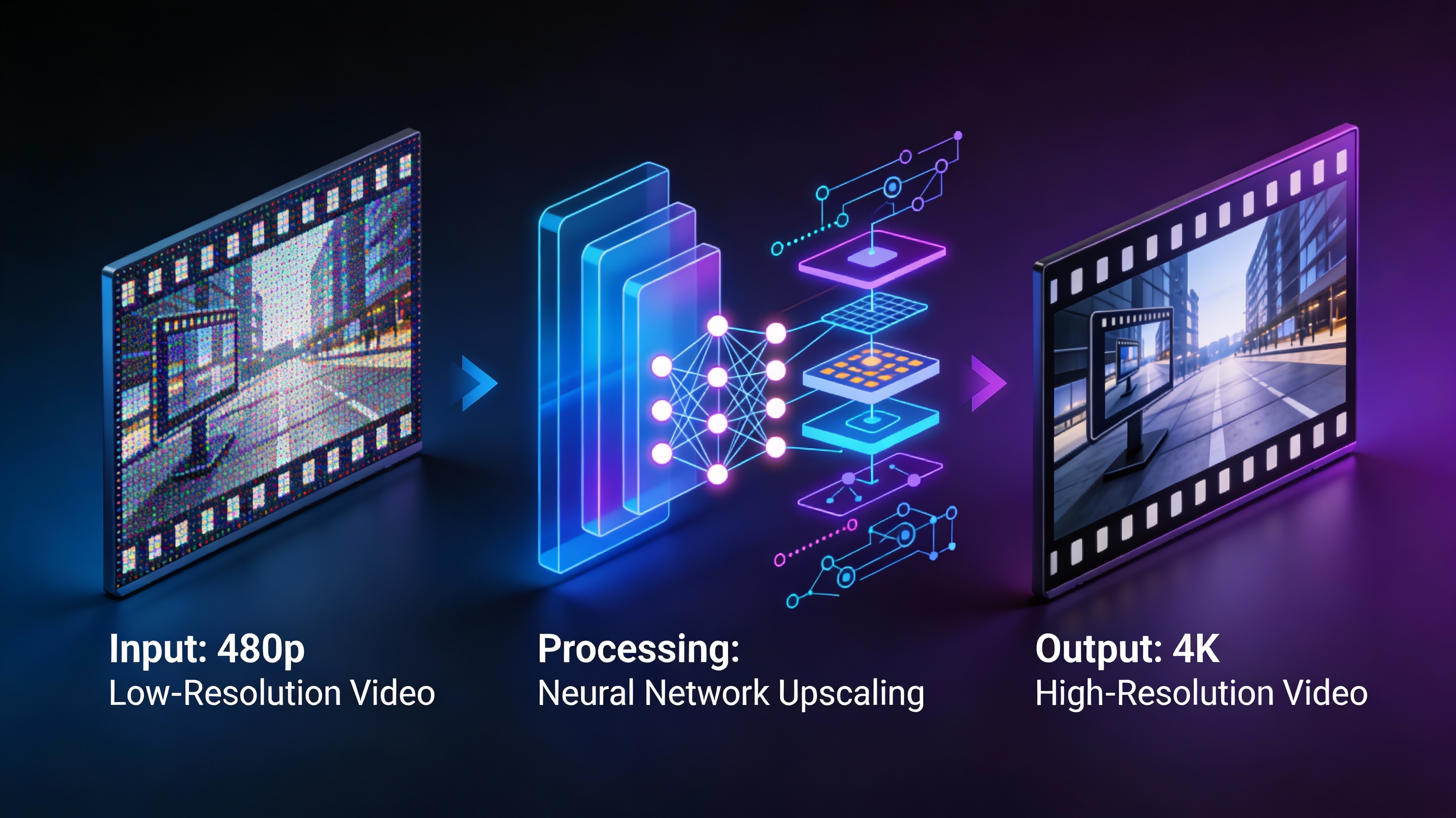 AI Video Upscaling Process: From 480p Input to 4K Output Through Neural Network Processing