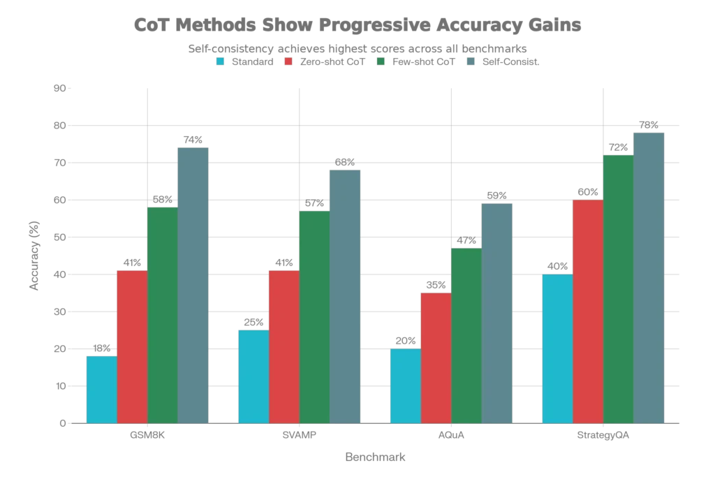 The research backing this is compelling. A landmark 2022 study by Google researchers Jason Wei, Xuezhi Wang, and colleagues showed that chain-of-thought prompting improves the ability of large language models to perform complex reasoning, particularly on arithmetic, commonsense, and symbolic reasoning tasks. The empirical gains are striking—prompting a 540-billion parameter model with just eight CoT examples achieved state-of-the-art accuracy on GSM8K (a benchmark of math word problems), surpassing even fine-tuned GPT-3 models with specialized verifiers.