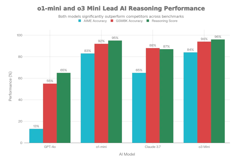 More recent benchmarks from 2025 show even more dramatic advances. O3 Mini achieved an 84% success rate across complex reasoning tasks, while Claude 3.7 demonstrated 87.5% success in pure logical reasoning domains. These represent leaps of 30-40 percentage points over standard prompting approaches.
