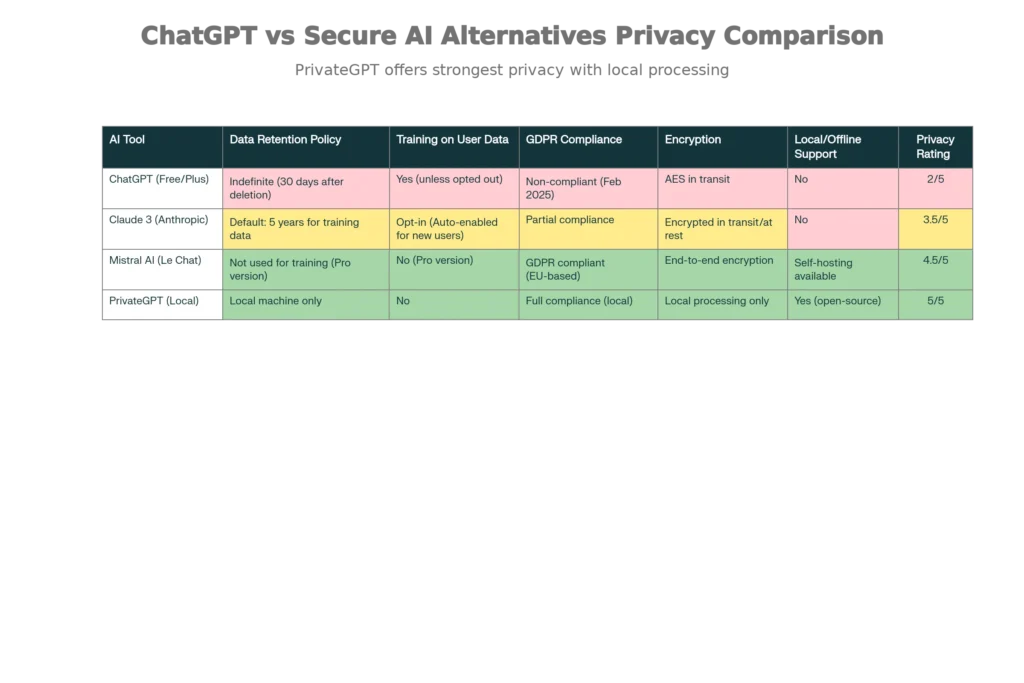 But you have options. Mistral AI proves that powerful AI doesn’t require compromising privacy. Claude shows that transparent, opt-in data practices are possible at enterprise scale. PrivateGPT and Ollama demonstrate that local processing eliminates the entire privacy problem by design.