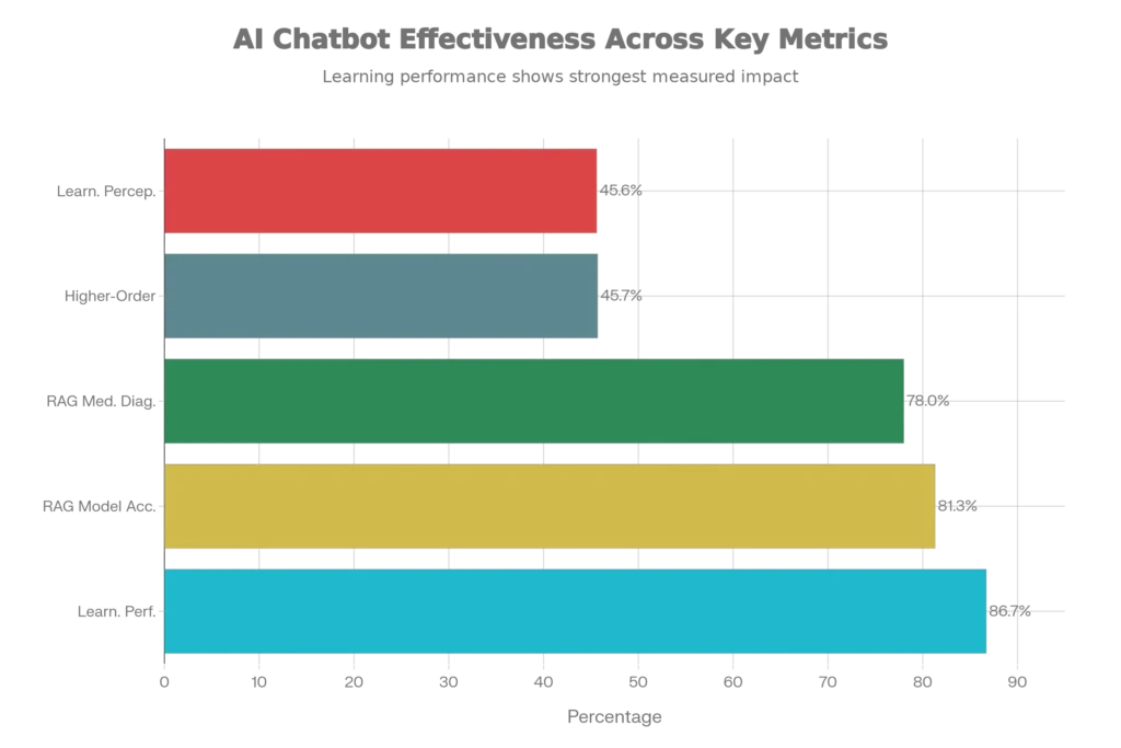 Recent academic research reveals the transformative potential of AI chatbot tools in educational settings. A comprehensive 2025 meta-analysis demonstrated that ChatGPT and similar tools have a large positive impact on learning performance with an effect size of 0.867—meaning substantial improvement in how quickly and effectively students grasp complex material. The study also showed moderately positive impacts on learning perception (g = 0.456) and higher-order thinking development (g = 0.457).