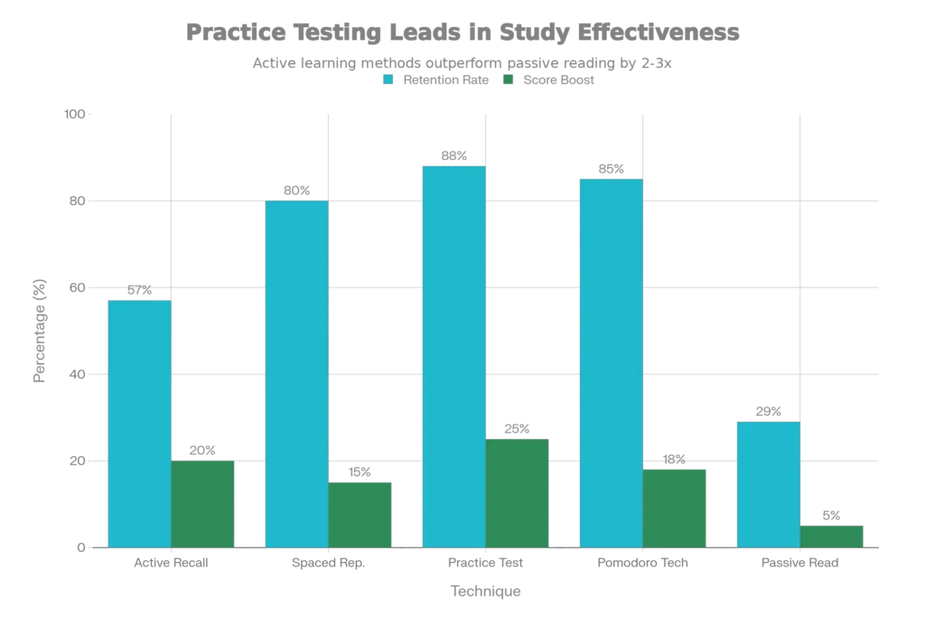 Passive reading (highlighting, re-reading notes) results in only 29% retention. In contrast, active recall—forcing your brain to retrieve information from memory—achieves 57% retention, nearly double the effectiveness.