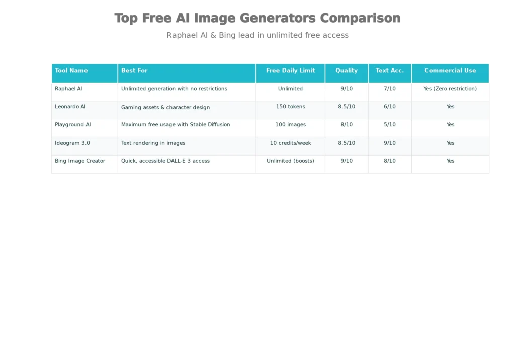 Meanwhile, Raphael AI’s unlimited generation, Leonardo AI’s gaming-focused models, Playground AI’s 100 daily images, Ideogram 3.0’s text mastery, and Bing Image Creator’s DALL-E 3 access combine to cover virtually every professional use case without subscription friction.