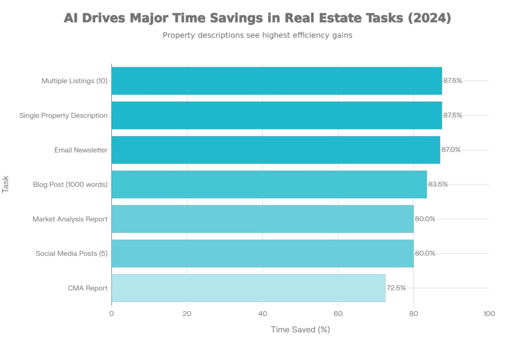 - Single property description: Manual (45-60 min) vs. AI-assisted (5-10 min) = 85-90% time savings