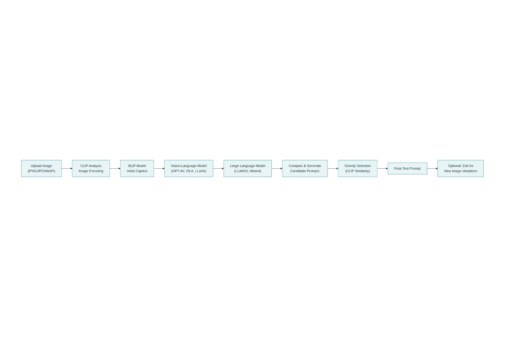 In the reverse prompting pipeline, BLIP typically serves as the initialization step. Given an image, BLIP generates an initial text description that captures the core elements: “a black and white cat with blue eyes wearing a bow tie.” This description forms the foundation that subsequent refinement steps will improve.