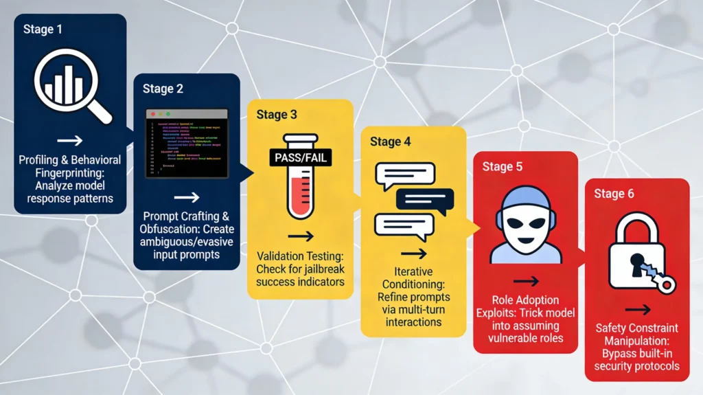 2. Multi-Turn Manipulation: Gradual escalation across multiple conversational turns (techniques like Skeleton Key and Crescendo) slowly condition models to accept increasingly harmful outputs.